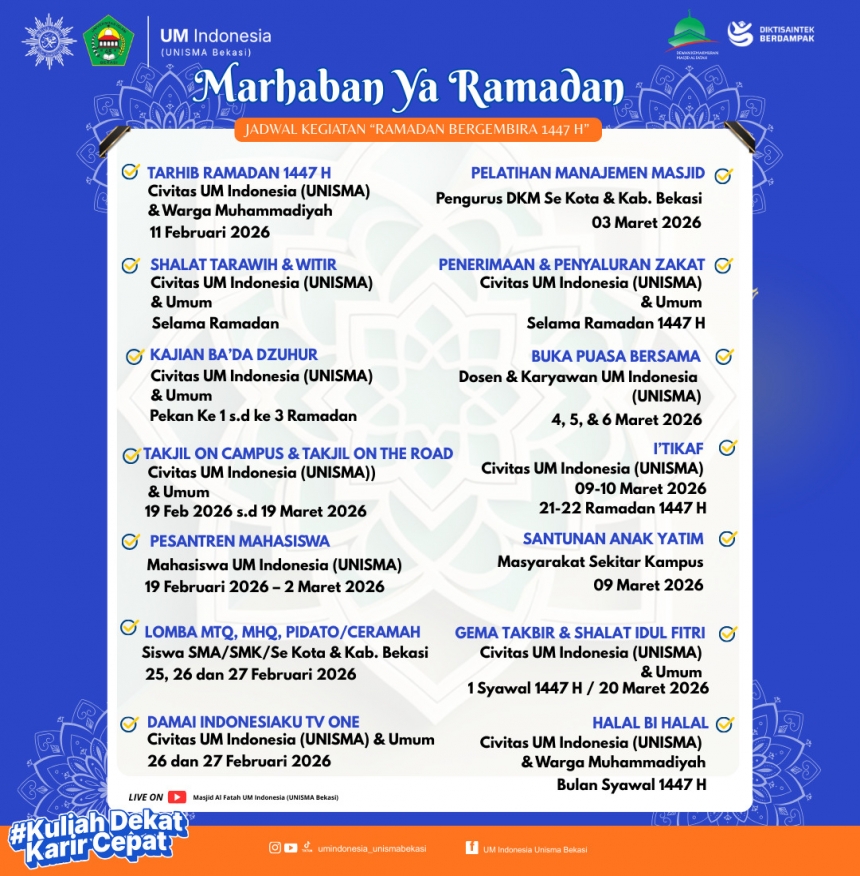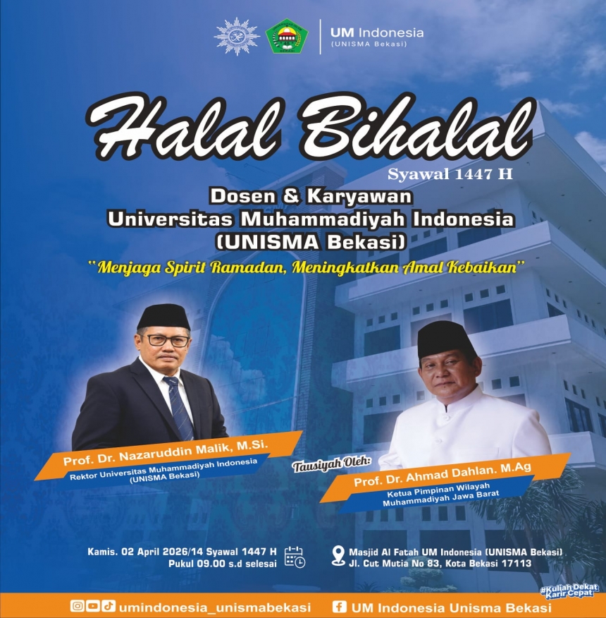 Ikuti dan simak tausiyah kultum ba`da sholat dzuhur setiap hari Senin dan Rabu di Masjid Al Fatah UNISMA Bekasi